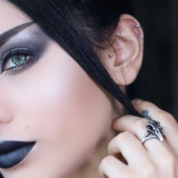 Alchemy Rabeschadel Kleiner ring - a smaller and more discreet raven's skull ring, authentically detailed and in polished, antiqued pewter set upon a split ring shank.