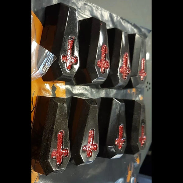 Hexbomb Macabre Casket Hex hexsoap is solid black, lit with red bio glitter. This soap comes in 2 fragrances so choose your poison!