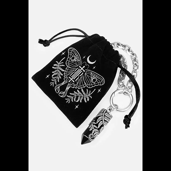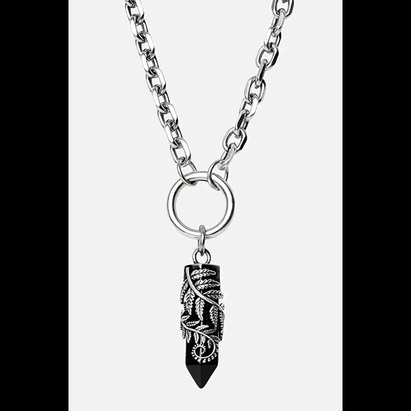 This dark boho Restyle Crystal Fern O-Ring choker features a sculpted metal fern that wraps protectively around a sharp, faceted black crystal. Suspended from a chunky chain, the geometric stone hangs like a dark forest talisman. The O-Ring clasp at the front acts as both a bold detail and the necklace fastening.